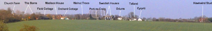 Continuing along Church road to our left is the older Orchard House and Walnut Trees, the modern bungalow Port-na-Craig, and the two wood-clad Swedish Houses. Then two more modern bungalows Talland, and Cyrynti, before coming to the new entrance to the Hawkwind Stud. | ||||